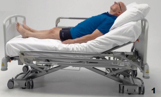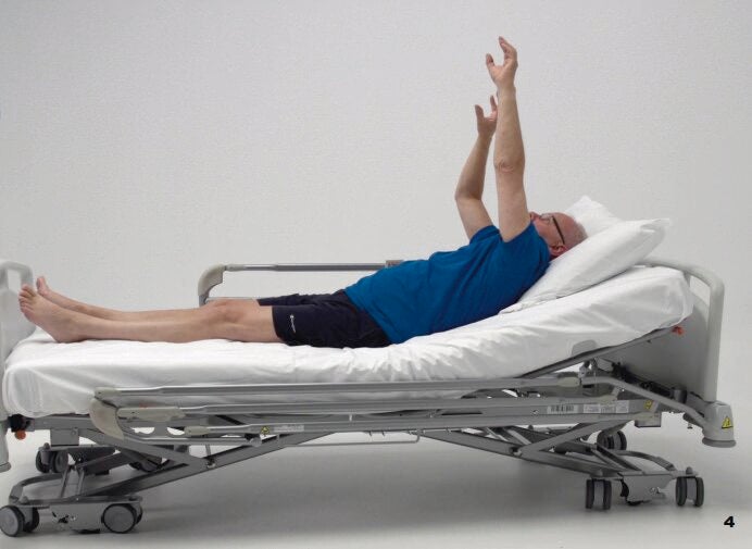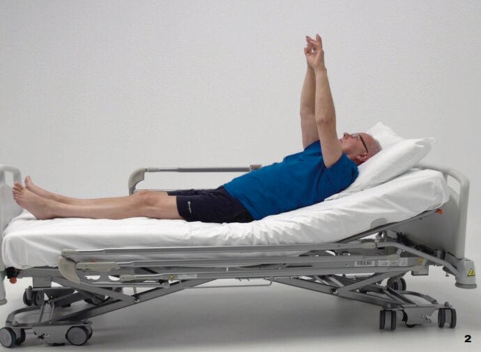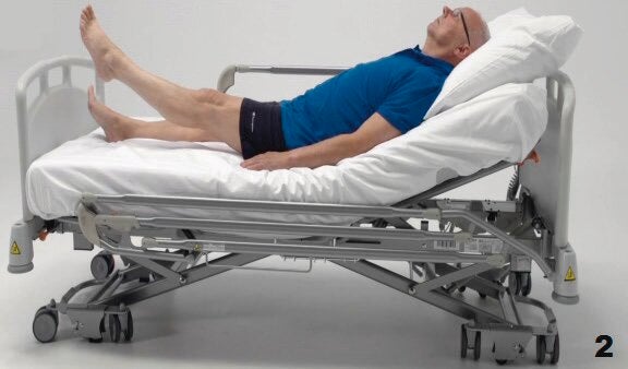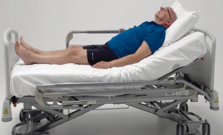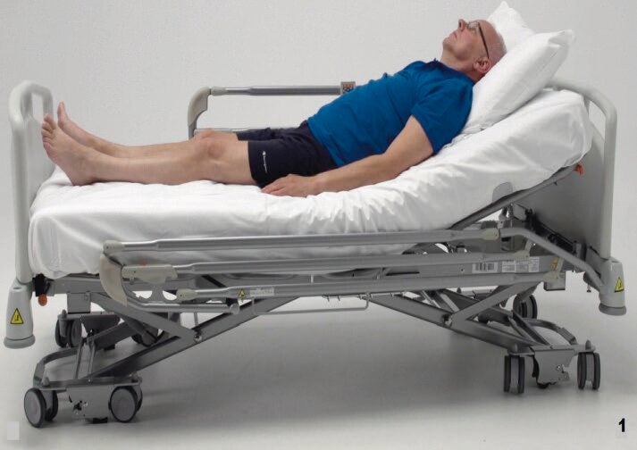 - Ga op uw rug liggen met de rugleuning iets omhoog en de benen gestrekt.