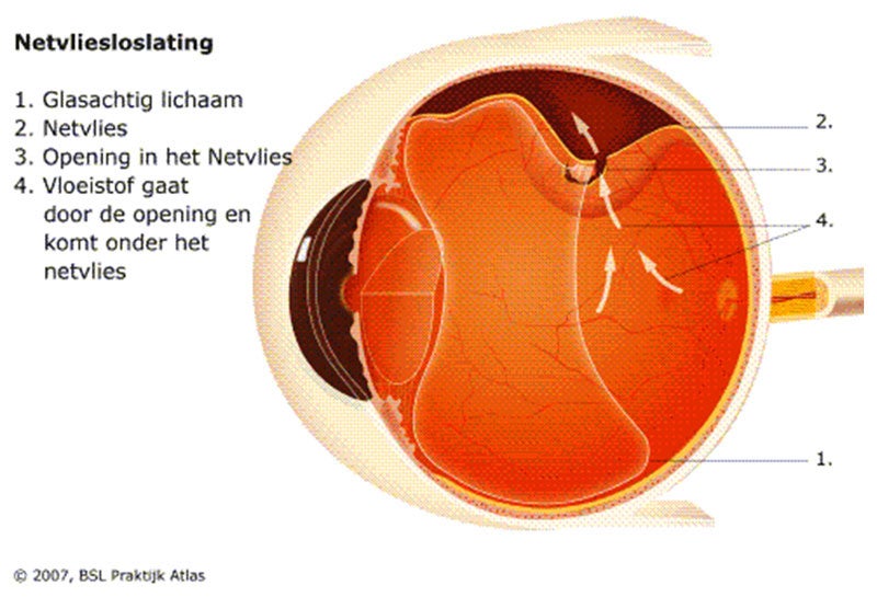 Als het netvlies loslaat ontstaat op die plaats een vlek in beeld. Als ook de gele vlek loslaat verdwijnt het scherpe zien.